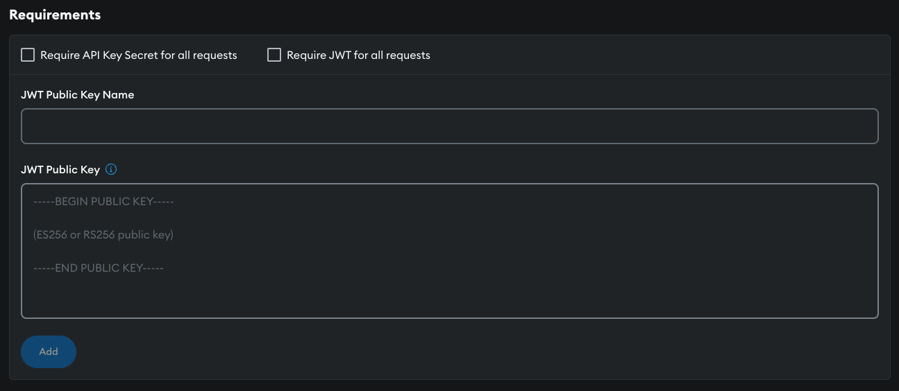 Enable JSON Web Tokens (JWTs) for all requests in the API key's Settings tab.
